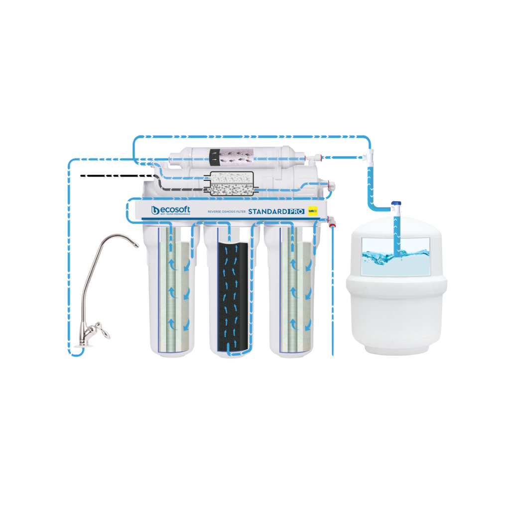 De Ecosoft PURE Standard omgekeerde osmose filters bieden een betaalbare en veilige oplossing voor zuiver drinkwater. Met een krachtig 5-staps filtratieproces en een mineralisatiefase verwijdert het systeem tot 99% van onzuiverheden en voegt het essentiële mineralen toe.